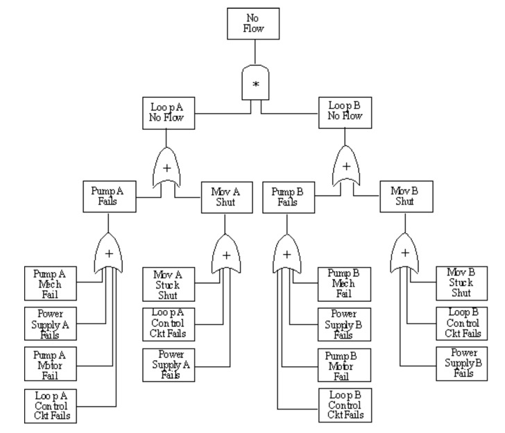 These steps include devising a coding system for components (loops) to ensure consistent basic event labeling. Ensure modeling within a system is carried out to a level where all the support system common points will show up. Use transfers to continue modeling of the support systems or shared equipment when model will consist of more than one basic event failure. The detailed fault tree for this example is given by Greenberg and Cramer, p. 154-5, and the two diagrams are too large and detailed to be shown here.