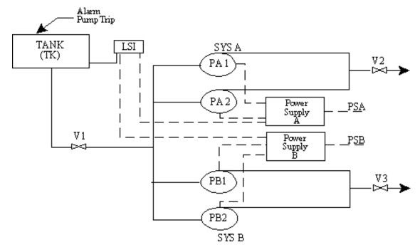 The process flow diagram for this diagram is a tank with a fill line and three exit lines going to different parts of the plant. In this example there are two redundant pumps and two redundant power supplies to be analyzed. The two redundant power supplies and two redundant pumps can be foiled by a single level switch failure. When constructing a fault tree for a system like this one, care must be taken to show the common reliance on a single level switch for the control signal to the pumps.
