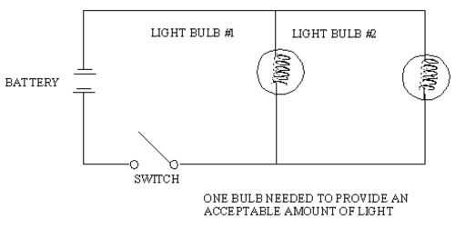 This slide shows an electrical circuit with one battery and two light bulbs in parallel. Light from a single bulb is sufficient for the system’s success.