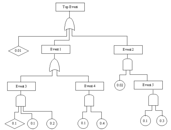 The calculations start at the bottom. Event 5 is an AND gate, and the product of probabilities is used. Events 3 and 4 are AND gates, also. Event 2 uses the results for event 5 (0.03) and 0.02 in the equation for an AND gate.