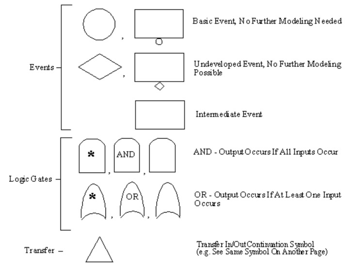 Top and intermediate events are shown as rectangles with a description inside the symbol. Primary or basic events are initial faults and are shown as circles or rectangles with small circles attached.
