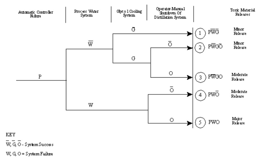 Here the failure is an automatic process controller. There are three subsequent events that can affect the outcome of the initiating event: a process water system, a glycol cooling system, and an operator who can manually shut down the system.