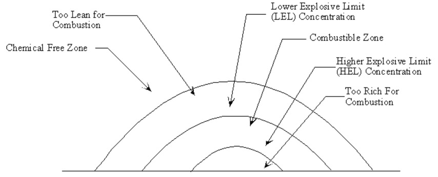 This diagram illustrates the range of compositions in a vapor cloud from the release of a combustible gas. In UVCE analysis, the concentration is integrated over the volume contained within the ellipsoid surfaces to obtain the detonable mass. Greenberg and Cramer, p. 202-207, provide equations to evaluate the concentration ranges shown on this diagram as a function of the gas release rate.
