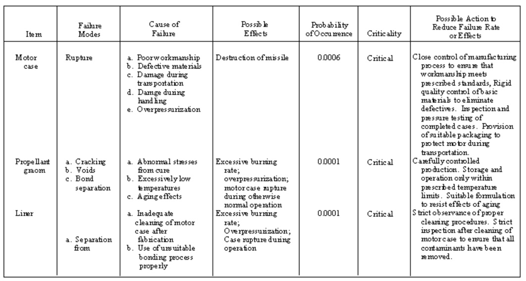 A table like the one shown here from Greenberg and Cramer is used to identify a failure mode and its immediate consequences on the system. This enables the analyst to sort the results and produce a ranking of component failures. The ranking can be by system criticality or by probability of occurrence. This table shows the designation of a component failure by criticality and by probability of occurrence.